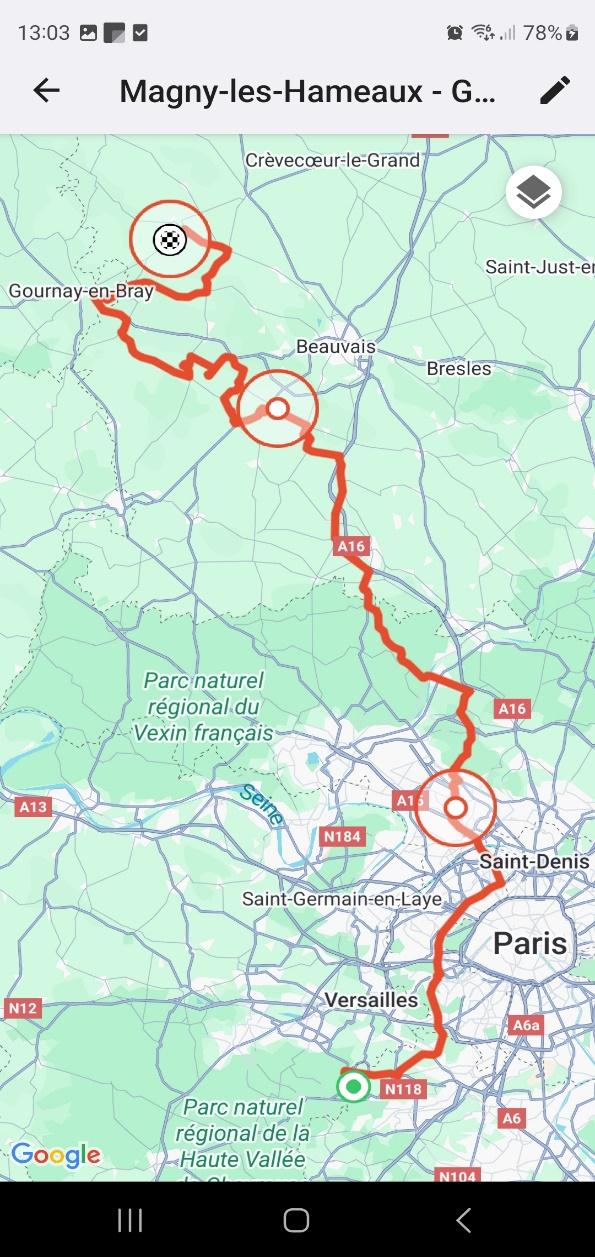On continue ensuite pour les derniers kilomètres de la balade en direction de Conflans-Sainte-Honorine où nous arrivons un peu après 18h avec plus de 270km parcourus et pas les derniers, bien que nous soyons le groupe « tranquille ». Antoine nous félicite même en nous disant qu’on est passé d’un groupe lent le matin à plutôt modéré l’après-midi (mais les routes s’y prêtaient aussi plus). Tout le monde se prépare à repartir en direction de chez soi et c’est à ce moment-là que je cherche mon téléphone dans la poche de mon blouson mais que je me rends compte que la poche est ouverte et vide ! Oh non, j’espère ne pas l’avoir perdu en roulant …ou à la station-service lorsque j’ai enlevé la doublure du manteau . Cédric essaye donc de m’appeler mais rien de sonne dans le top case, il n’est définitivement pas là . Là un éclair me traverse l’esprit, il était dans ma poche arrière de pantalon à Gerberoy après la marche et a donc dû tomber pendant la pause dans le champs…