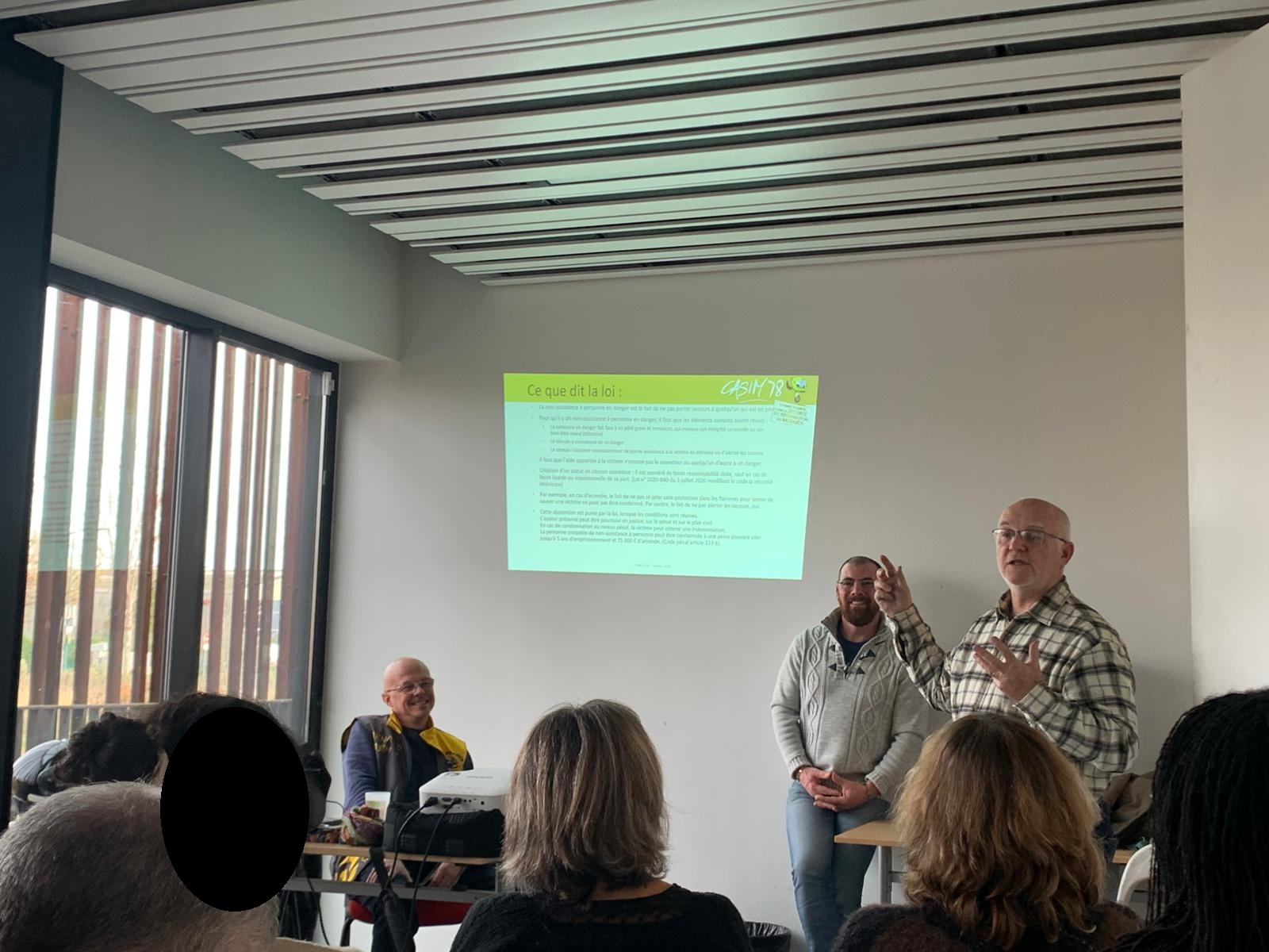 Au programme de ce matin, on ne parle pas de gestes techniques de secourisme, on verra ça cet après-midi. On va plutôt parler du reste : comment bien réagir quand on arrive sur un accident de la route, un petit rappel sur les obligations légales de porter assistances aux victimes, les bonnes pratiques pour le faire tout en assurant sa sécurité et celle des autres, ce à quoi il faut être attentif pour évaluer rapidement la situation, et comment passer le bon appel au secours, celui qui permettra aux services d’urgence d’avoir toutes les informations pour une intervention rapide et efficace. Je ne rentre pas dans les détails ici, vous aurez toutes ces informations en suivant ce CPM à la CASIM. (Un peu d’auto-promo, ça ne fait pas de mal !) Je profite d’être là pour prendre quelques photos pour alimenter les réseaux sociaux de l’association (j’ai parlé d’auto-promo déjà ?), et j’aide mes collègues à répondre aux nombreuses questions. Ce CPM fait toujours beaucoup parler et c’est très bien, le partage des expériences est bénéfique pour tout le monde. Nos trois présentateurs arrivent tout de même à ne pas trop s’éloigner du sujet et à terminer à l’heure pour la pause déjeuner.